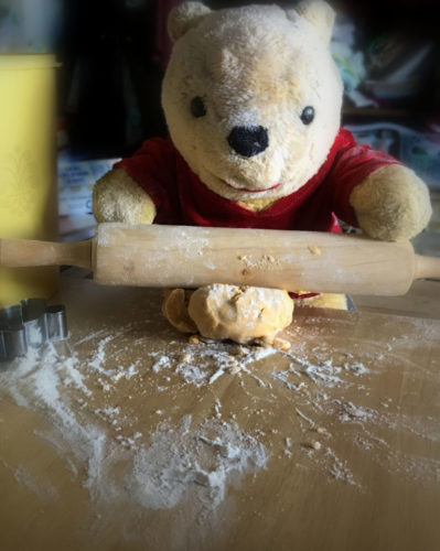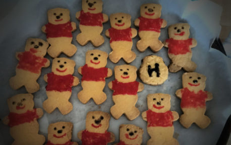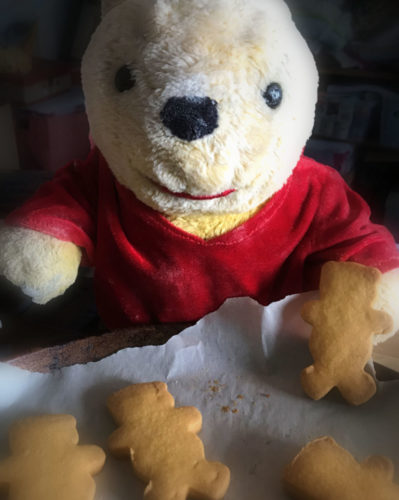 I was happy with the idea of making bear cookies, in general. But gradually it turned to Pooh cookies, specifically. But I didn’t want honey cookies. I saw a place selling butterscotch flavoring for candy or baking, and thought it’d be fun to try. I also decided to buy “gold” food coloring, in hopes of a more Pooh-ish sort of yellow. The icing was just “writing gel”, sold in tubes.